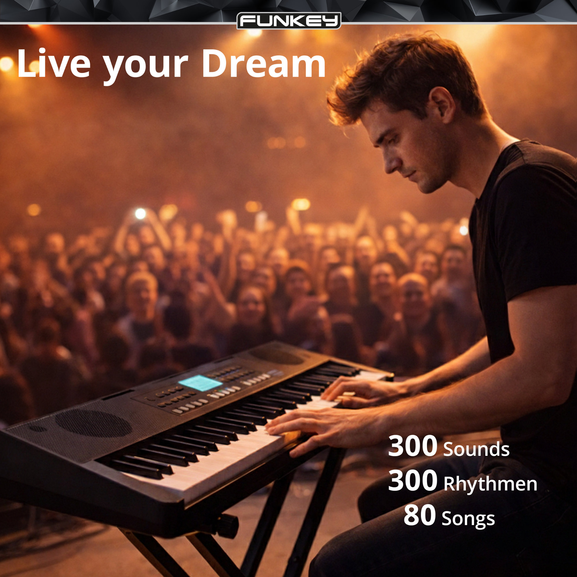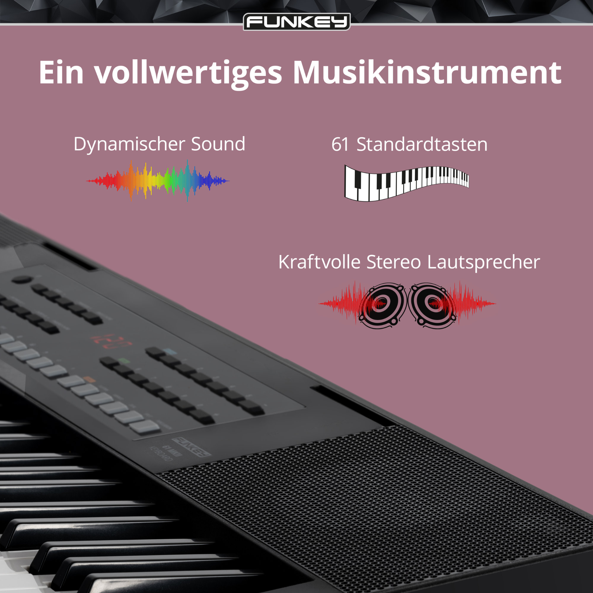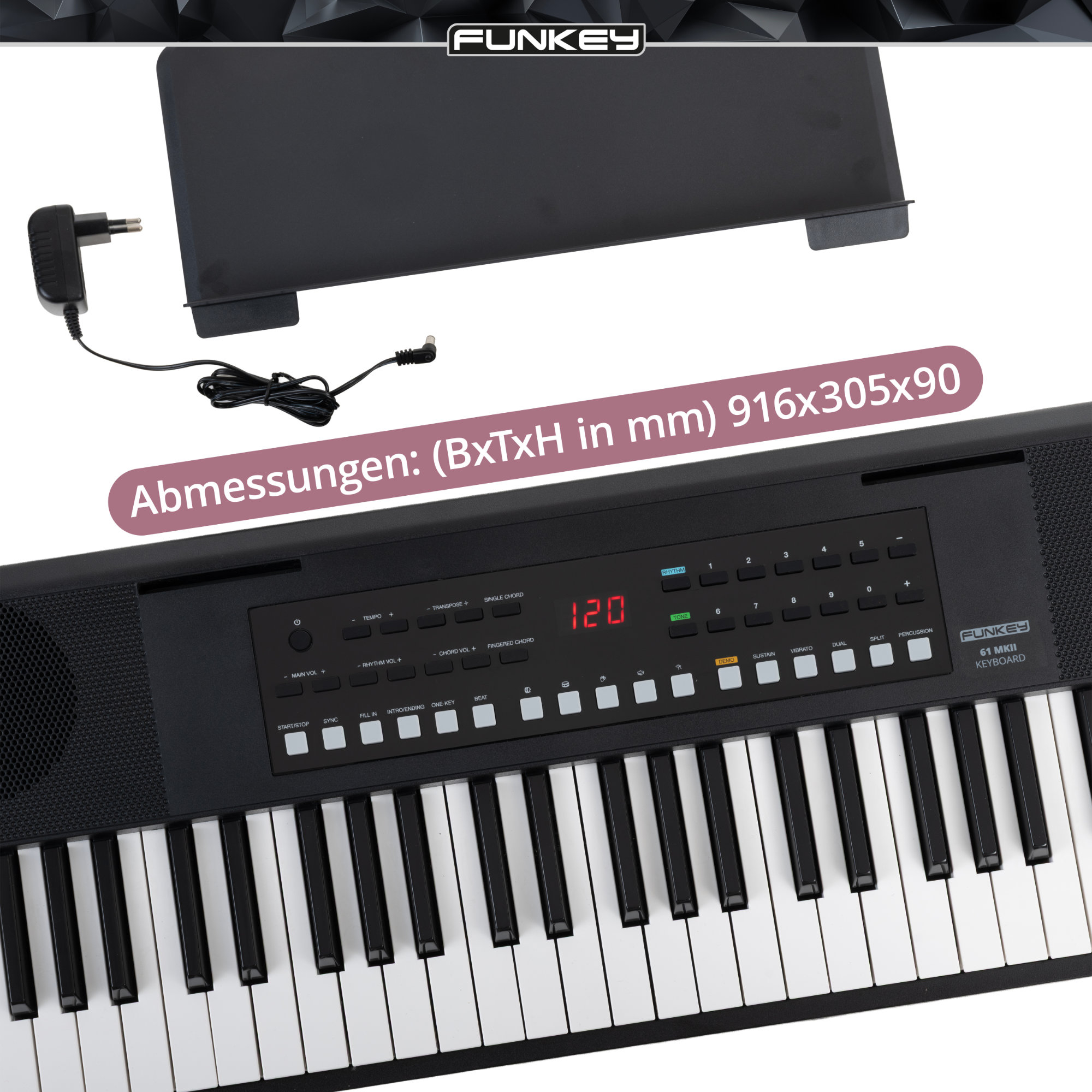 Das FunKey 61 MKII Keyboard schwarz ist ein modernes 61 Tasten Keyboard für Einsteiger, Schüler und ambitionierte Hobby-Musiker. Mit 300 Sounds, 300 Rhythmen und 80 Demo Songs bietet dir dieses E-Piano bzw. Digital Keyboard eine enorme Klangvielfalt. Die integrierten 2 x 5 Watt Stereo Lautsprecher sorgen für einen klaren, durchsetzungsfähigen Klang. Dank USB to Host Anschluss, Sustain-Buchse und Kopfhöreranschluss ist das Instrument flexibel im Home Studio, im Unterricht oder unterwegs einsetzbar.