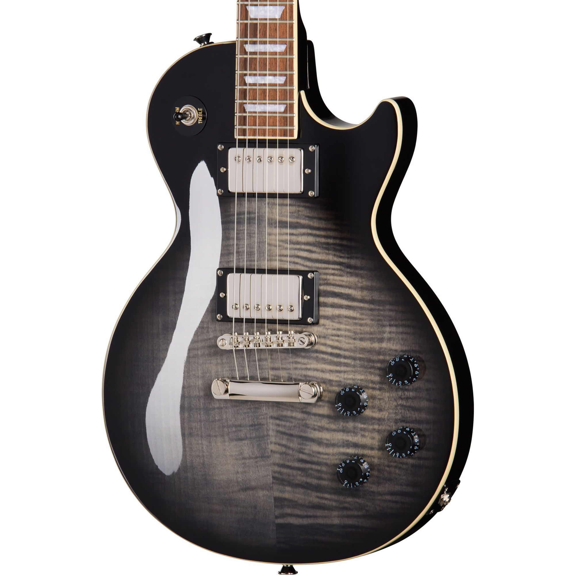 Der Body besteht aus massivem Mahagoni und ist mit einem AAA Flamed Maple Veneer versehen, das unter dem transparenten Transparent Ebony Burst Finish besonders elegant wirkt. Ein elfenbeinfarbenes Binding am Korpus und Griffbrett verleiht der Gitarre zusätzlich einen hochwertigen Vintage-Look, während die ergonomische Halsverbindung komfortablen Zugang zu den hohen Bünden bietet.