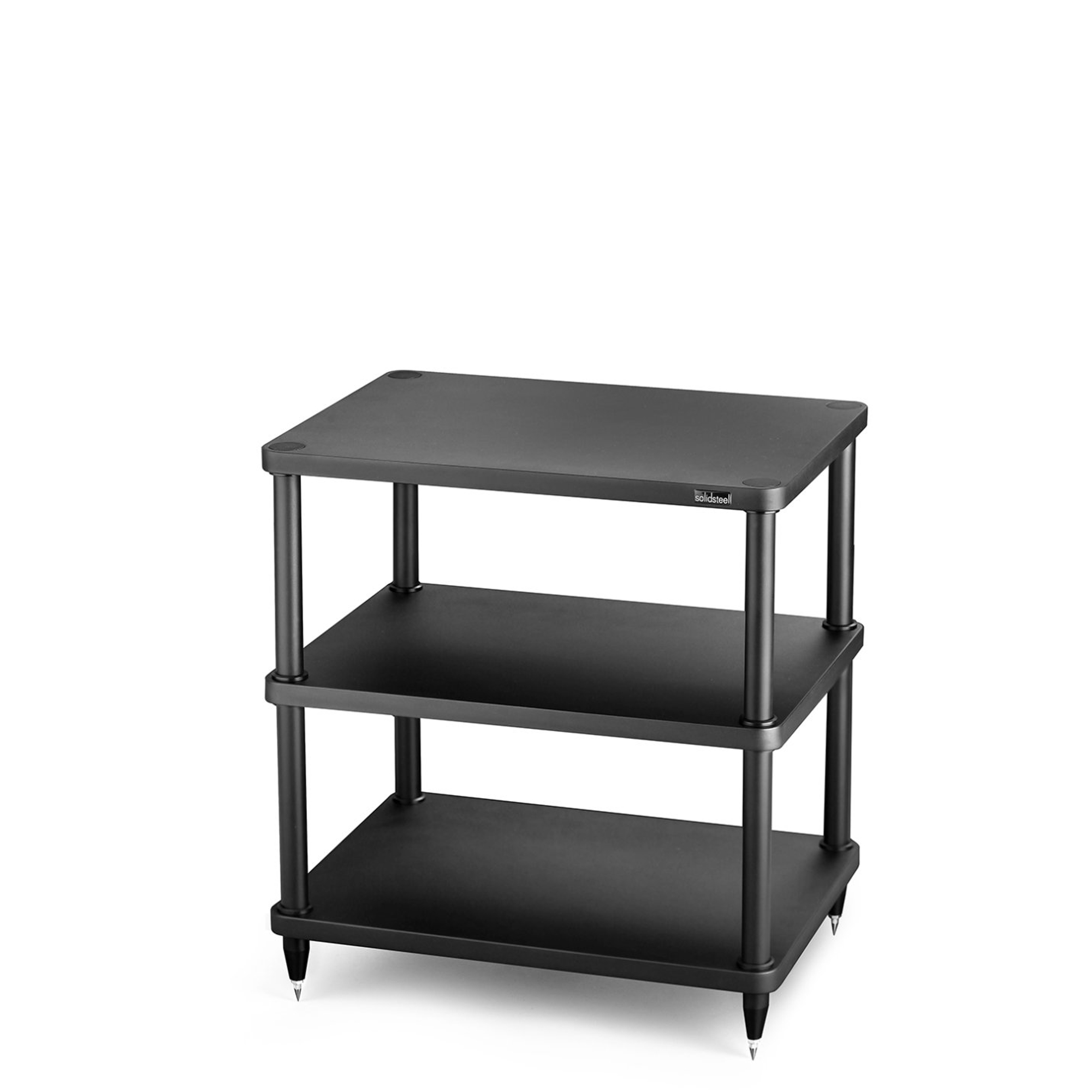The Solidsteel S3 combines a robust load-bearing structure of galvanized steel with anodized aluminum support rods. These are filled internally with damping material to effectively absorb resonance. The shelves are made from solid MDF panels coated with high-quality polymer laminate. That gives the rack not only its distinctive appearance but also excellent acoustic neutrality.