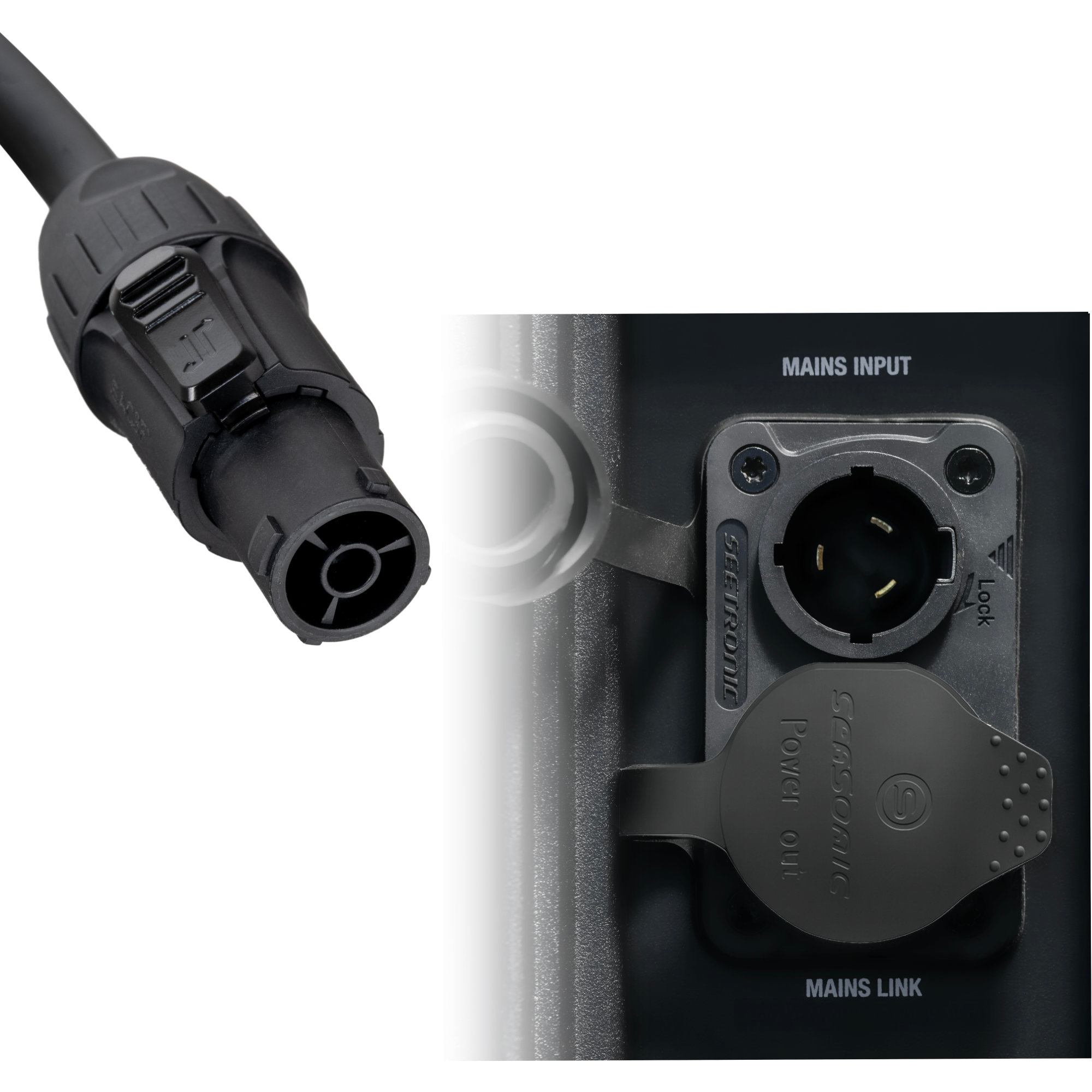 - Connector 2: Seetronic Power Twist TR1 female (PowerCon True 1-compatible)