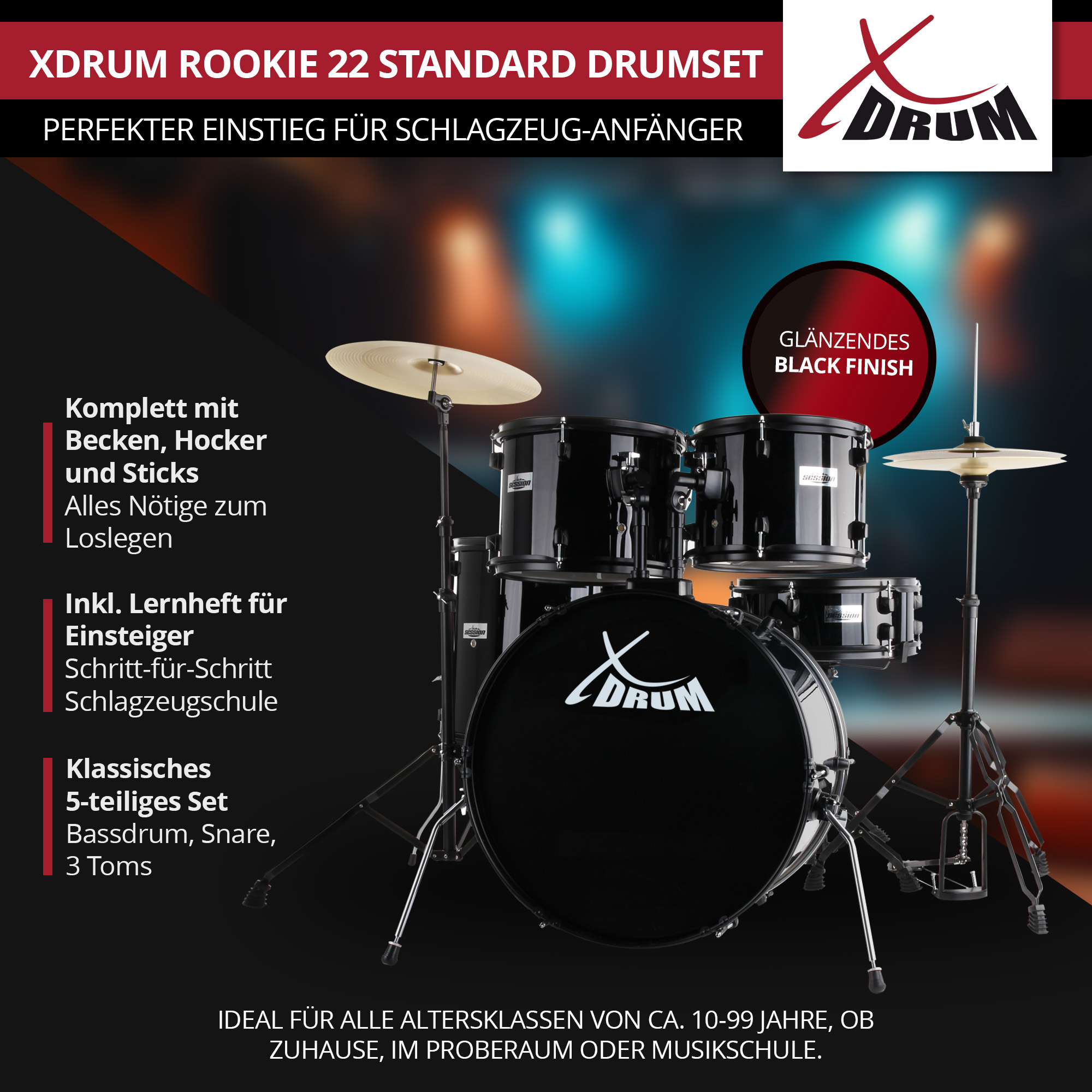 Um keine Wünsche offen zu lassen, bekommst Du das Set natürlich komplett mit den speziellen, leisen Übungsbecken mit geringem Sustain. Außerdem erhältst Du in dem Komplettset einen höhenverstellbaren Hocker, der es kleinen und großen Leuten gleichermaßen ermöglicht, bequem am Instrument zu sitzen, ein Paar Drumsticks und eine ausführliche Aufbauanleitung.