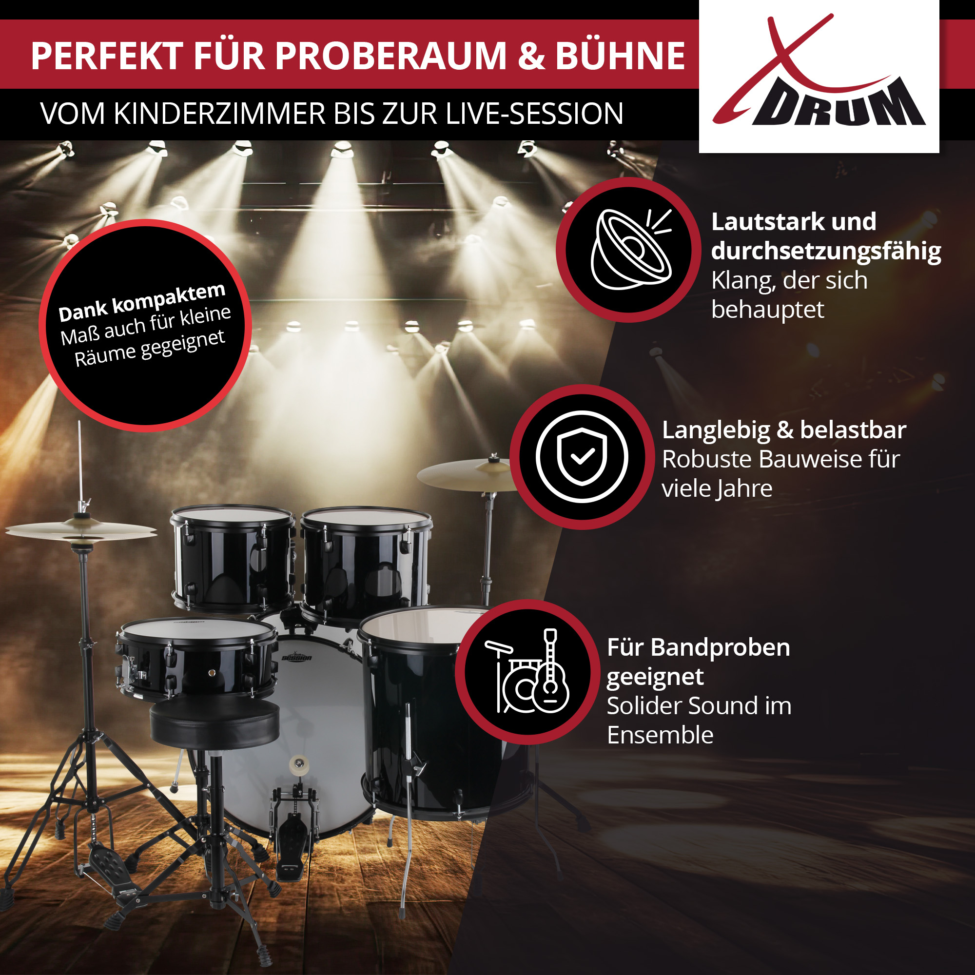 Kompletter Kesselsatz in robuster Verarbeitungsqualität mit stabilen Böckchen für exzellente Stimmbarkeit und außergewöhnlich guten Klang. Hardwarepaket mit kinderleicht zu justierenden Tomarmen für optimale Anpassung an jede Körpergröße. Hi-Hat und Fußmaschine kommen mit Kettenzug. Alle Ständer und Halterungen sind mit Memolocks ausgerüstet, was einen problemlosen Aufbau garantiert und die Justierarbeit vom ersten Aufbau bei jedem Wiederaufbau unnötig macht. Alle Trommeln sind mit hochwertigen Fellen ausgerüstet und bis auf wenige Handgriffe vormontiert.