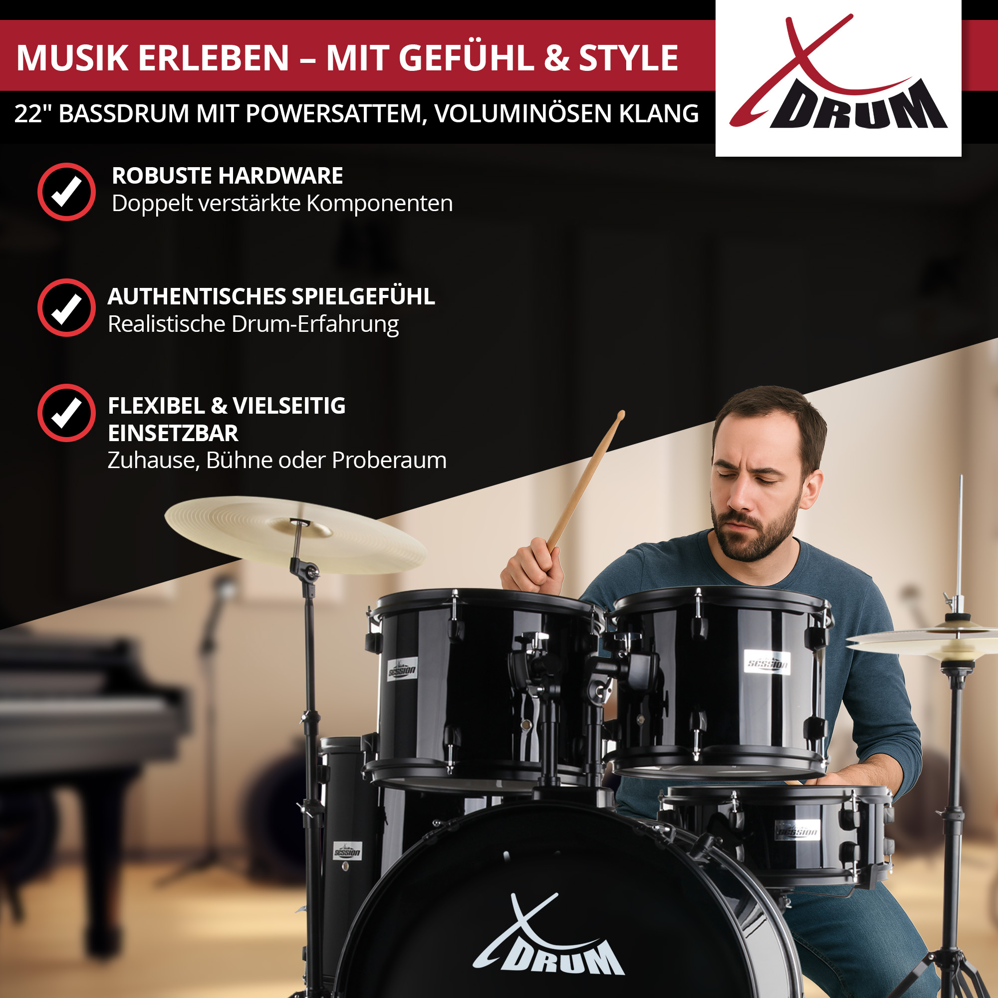 - Beckensatz bestehend aus Hi-Hat & Crash-Ride Becken