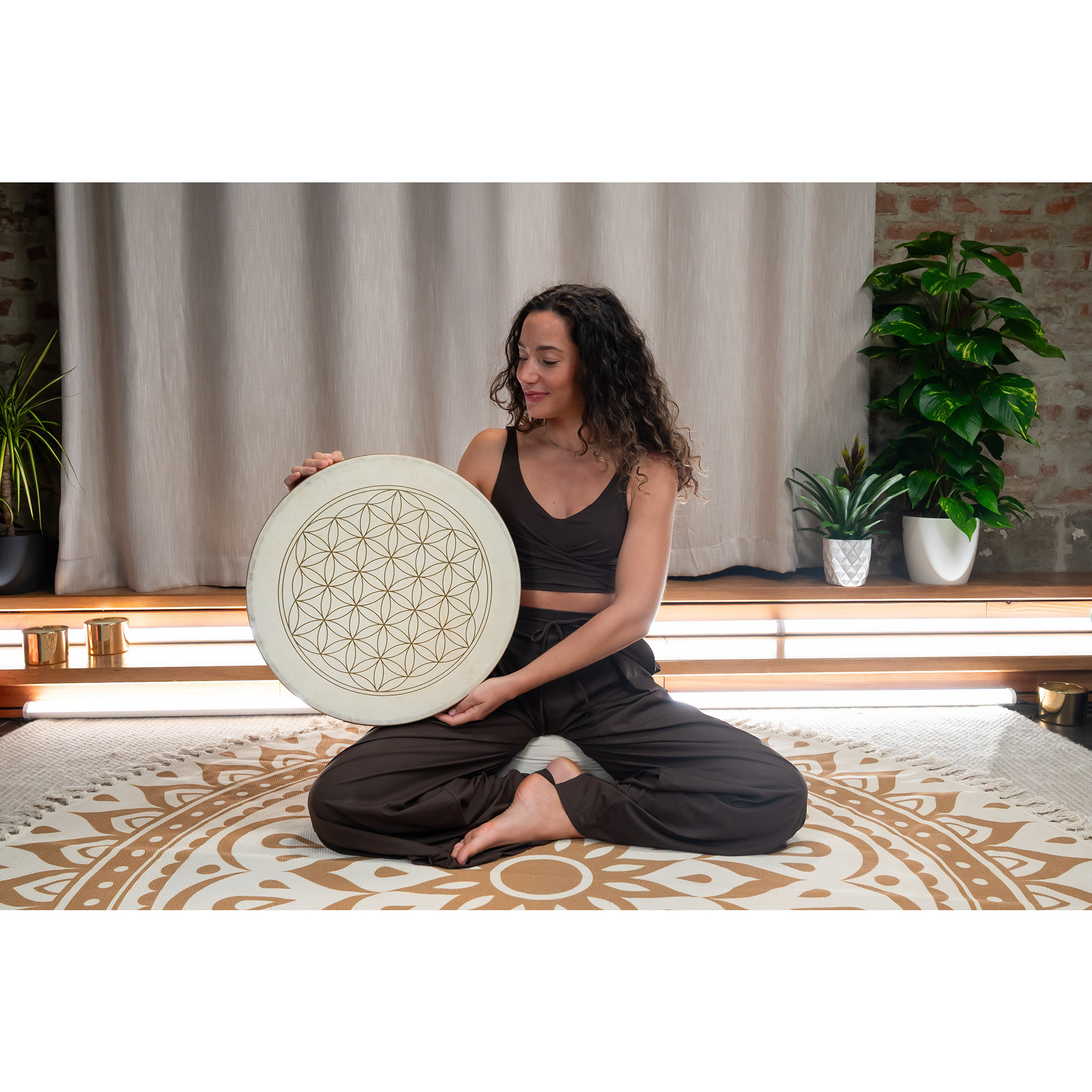 A nivel visual, esta Wave Drum está adornada con el símbolo de la Flor de la Vida, que en muchas culturas representa la armonía, el orden y la conexión de toda la vida. Este diseño dota al instrumento de una presencia espiritual especial y lo convierte en un elemento central tanto sonora como visualmente en cualquier práctica sonora.