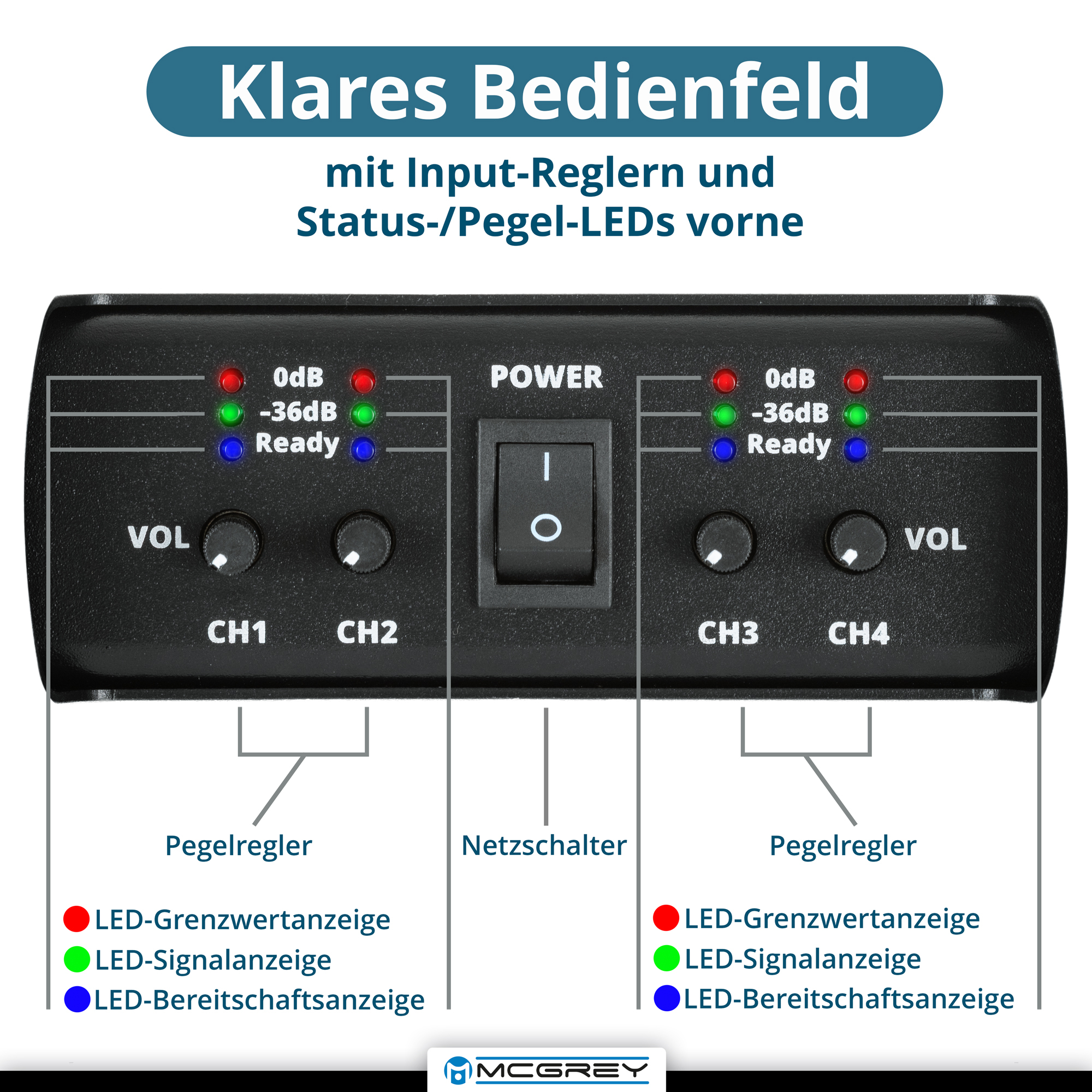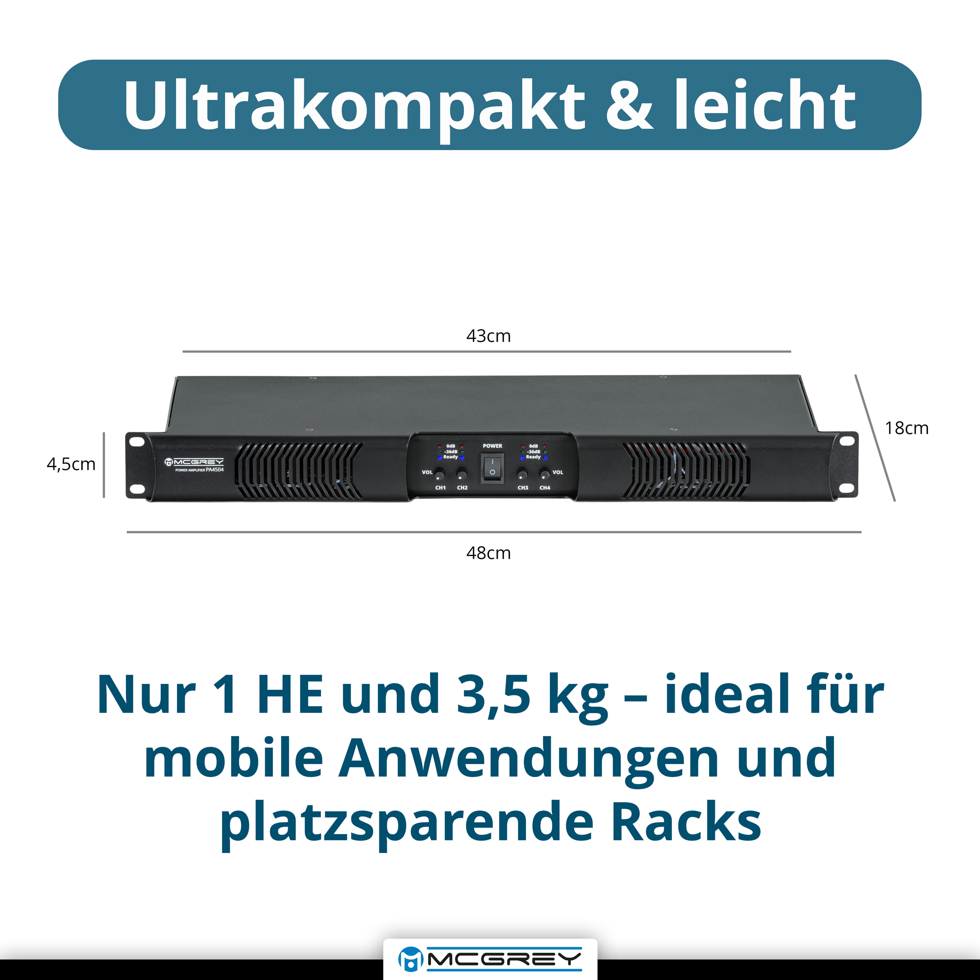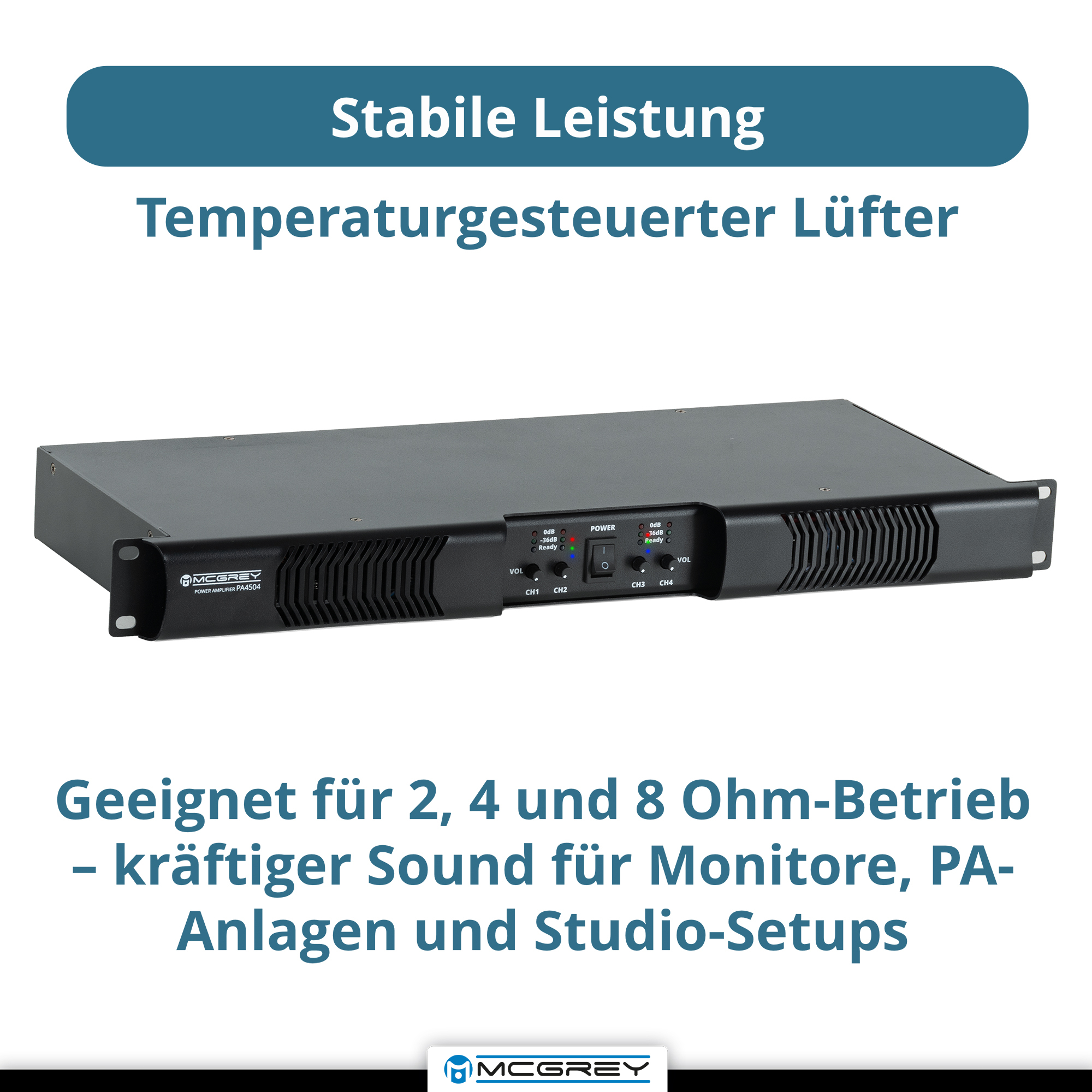 L'amplificateur McGrey PA-4504 délivre, avec 4x 450 W de puissance RMS, une amplification puissante et peu de distorsion pour tout système de sonorisation professionnel ou semi-professionnel. Grâce à sa robuste technologie Class-D, il séduit par son haut rendement, son faible poids et un rendu clair et dynamique - idéal pour les groupes, les DJs ou les installations fixes.