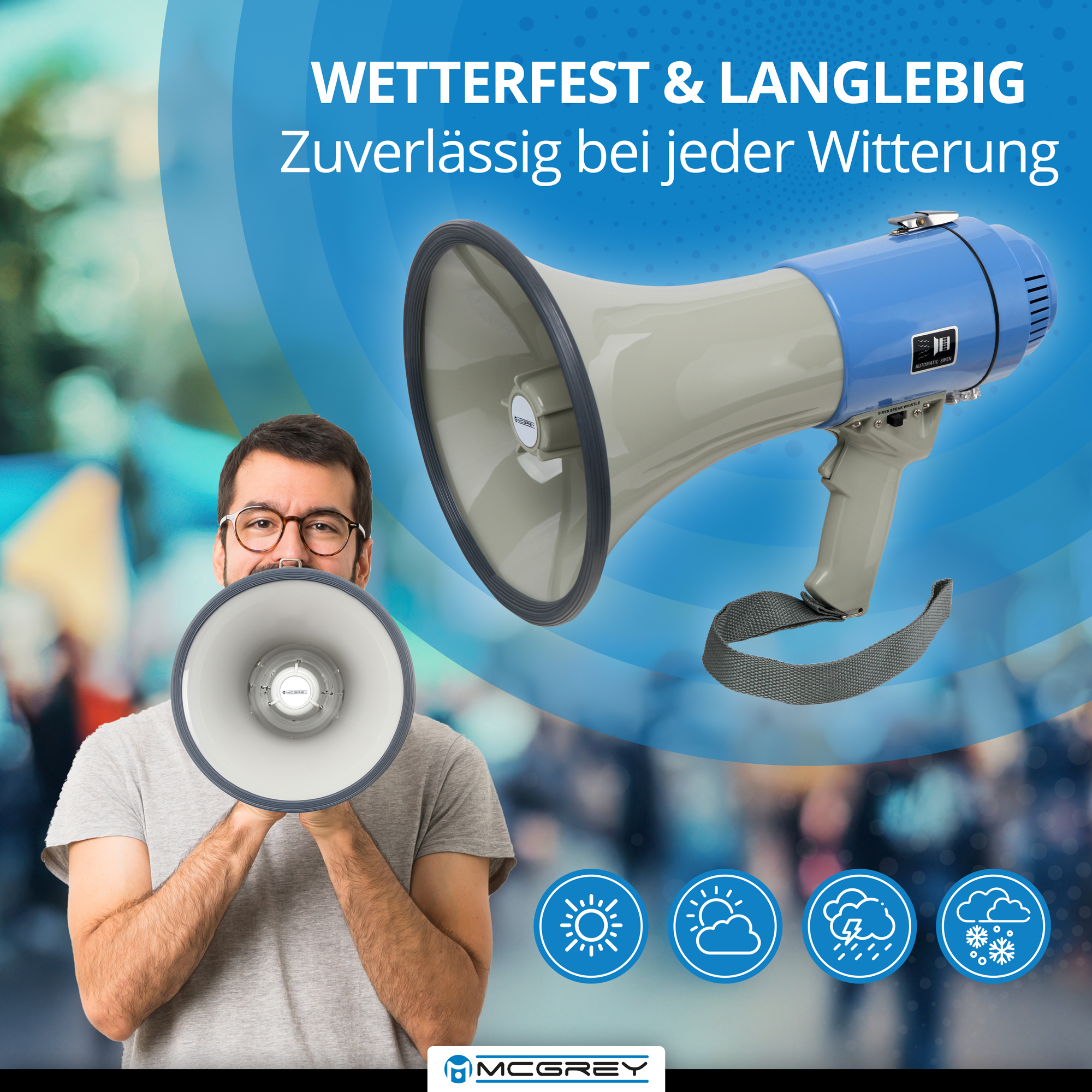 Das McGrey MP-200S Megaphon ist das ideale Hilfsmittel auf Baustellen, beim Bootssport, Fußballtraining oder für Reiseveranstalter, wenn eine Durchsage eine größere Menschenmenge erreichen soll. Damit das batteriebetriebene Sprachrohr dabei uneingeschränkt jeder Witterung standhält und genutzt werden kann, ist das Batteriefach wetterfest geschützt. Platzregen, Schlammschlacht, Sonnenschein - Deinem nächsten Stadionbesuch oder der nächsten Demo steht nichts mehr im Wege!