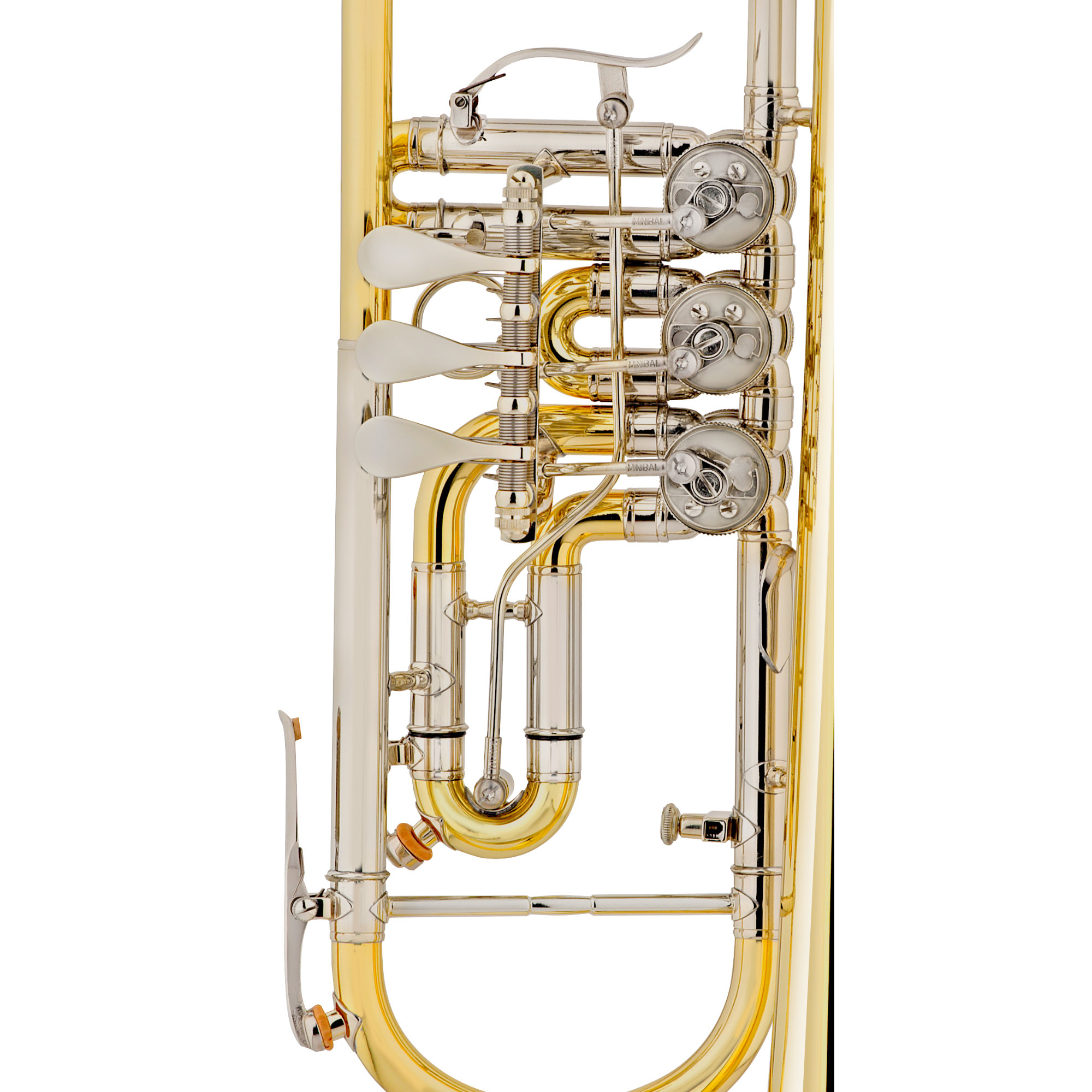 De ergonomisch geplaatste triggerhendel met verstelbare stopper op de 3e ventieltrek maakt een comfortabele tooncompensatie mogelijk. Door de 2 waterkleppen wordt het hanteren van het instrument vergemakkelijkt. Bovendien ben je met de voorgemonteerde marsbeugelhouder overal en direct speelklaar.