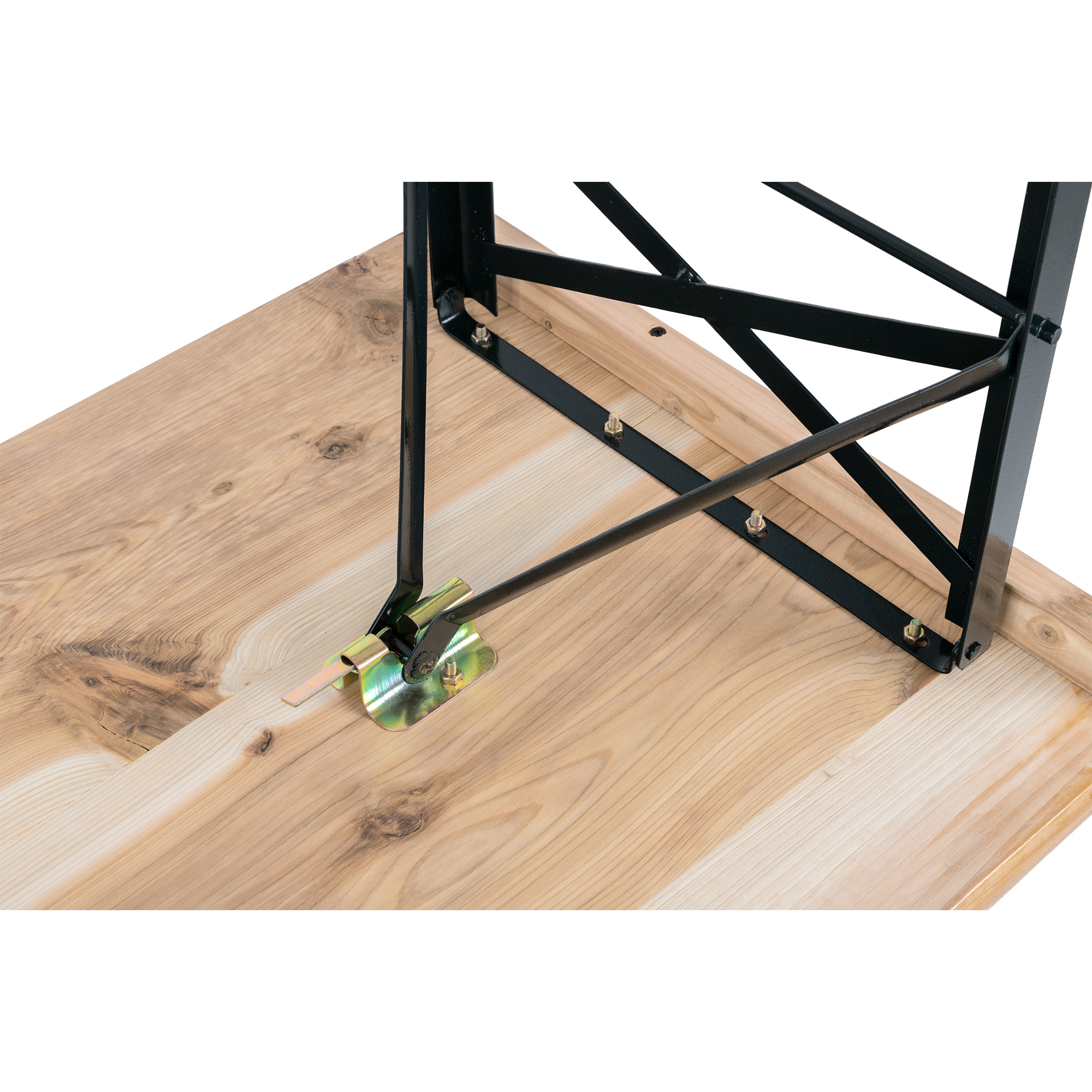 Dankzij scharnieren aan de onderzijde en stevige, opvouwbare stalen frames wordt het op- en afbouwen een fluitje van een cent. Bij niet-gebruik of voor transport is de tafel ook makkelijk en ruimtebesparend op te bergen.
